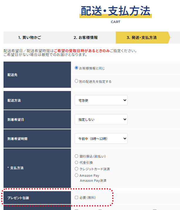 ご購入手続きの際、プレゼント包装のチェックボックス欄の「必要(無料)」をチェックしてください。