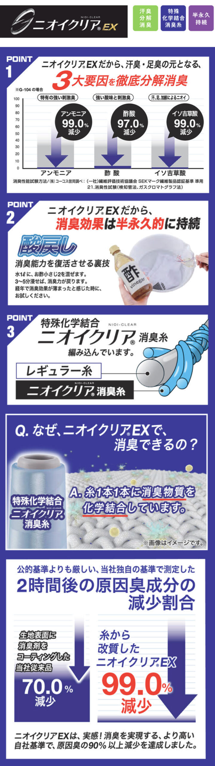 消臭成分を糸に化学的に結合させているため、洗濯や繰り返しの使用にも強く、効果が長持ち。