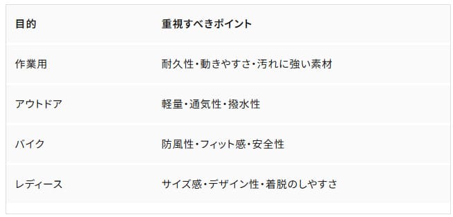 機能性+ファッション性を両立したモデルを選べば、作業だけでなくバイク・キャンプ・普段着にも活躍します。