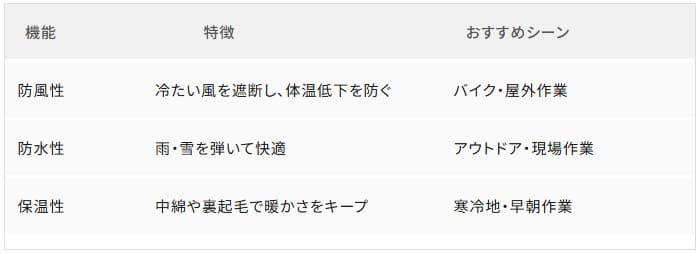 特に、防風性、防水性、保温性の3つの機能は、寒い季節において非常に重要です。